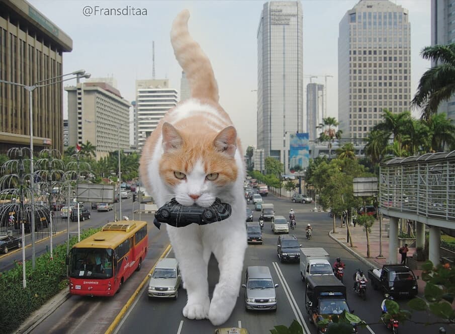 Frandsita Muafidin faz várias montagens com gatos gigantes em diferentes cidades do mundo e partilha tudo no Instagram.