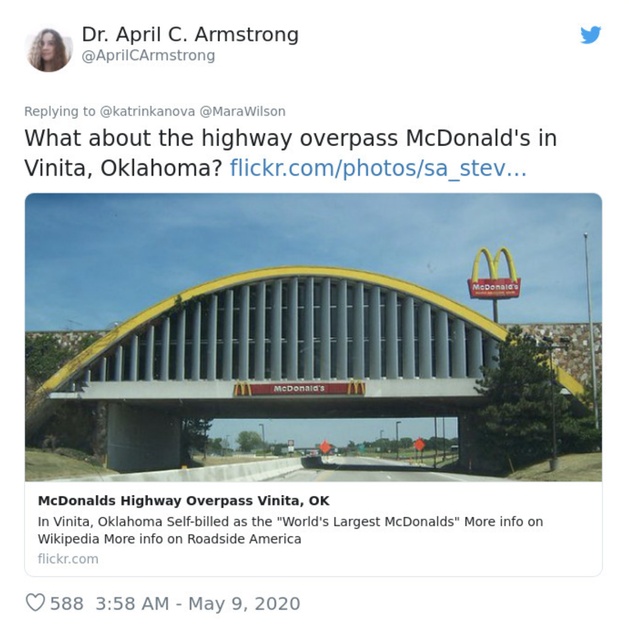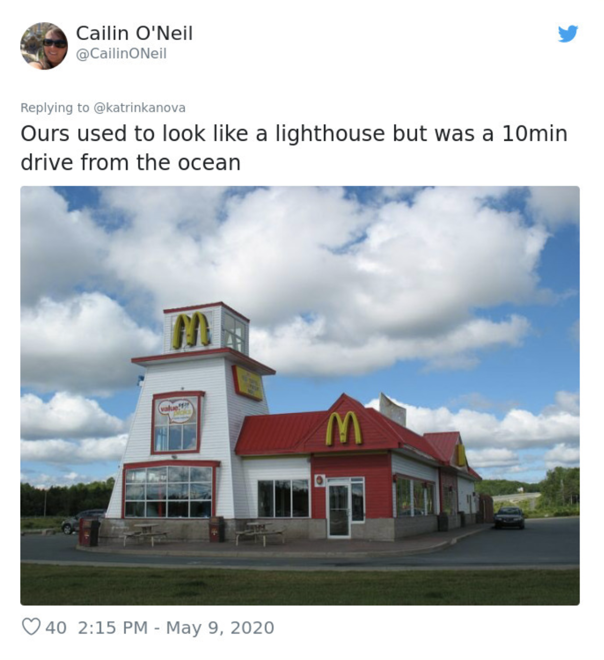 Katrinka, de Baltimore, Maryland, EUA, publicou algumas fotos de um restaurante em Freeport, Maine, que se tornou popular pela sua arquitetura singular. "Parece uma agência funerária por fora e uma casa de repouso por dentro", escreveu no Twitter. O tweet tornou-se viral e as pessoas começaram a partilhar os McDonald’s mais estranhos que já viram.